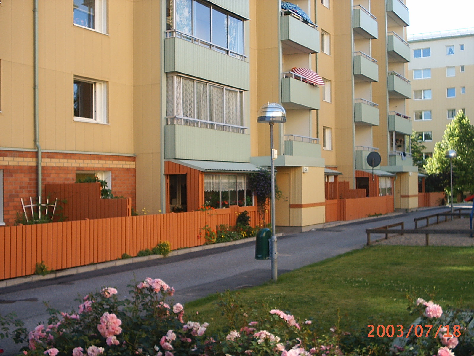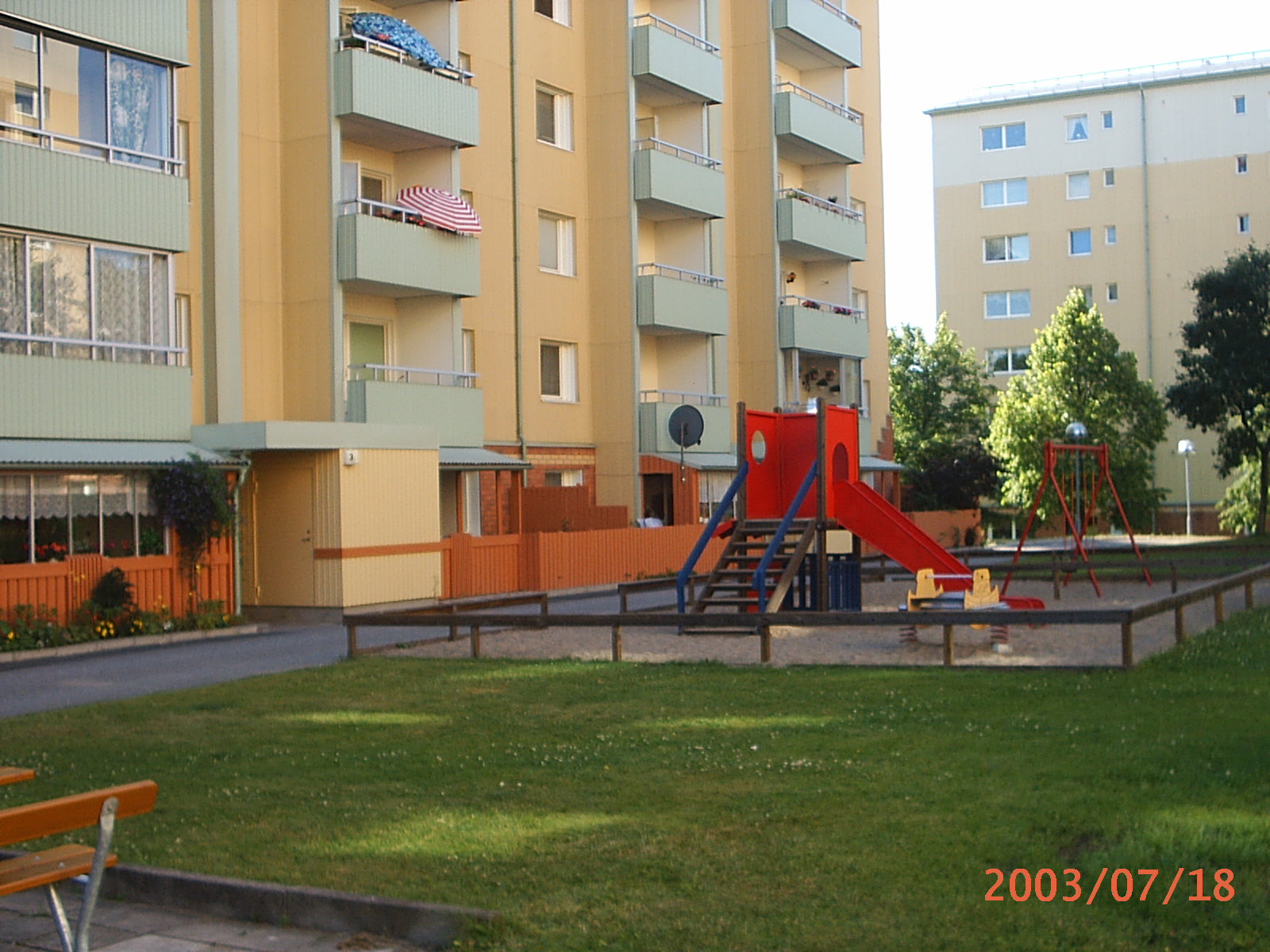 Sedan April i år har arbetet pågott med renoveringen av uteplatser och lekplatser på Brf. Kornet i Hallunda. Bilden till vänster visar en nymålad lekplats med starka och klara kulörer i rött och blått. Bilden i mitten visar de nyrenoverade uteplatserna. Samtliga målade i