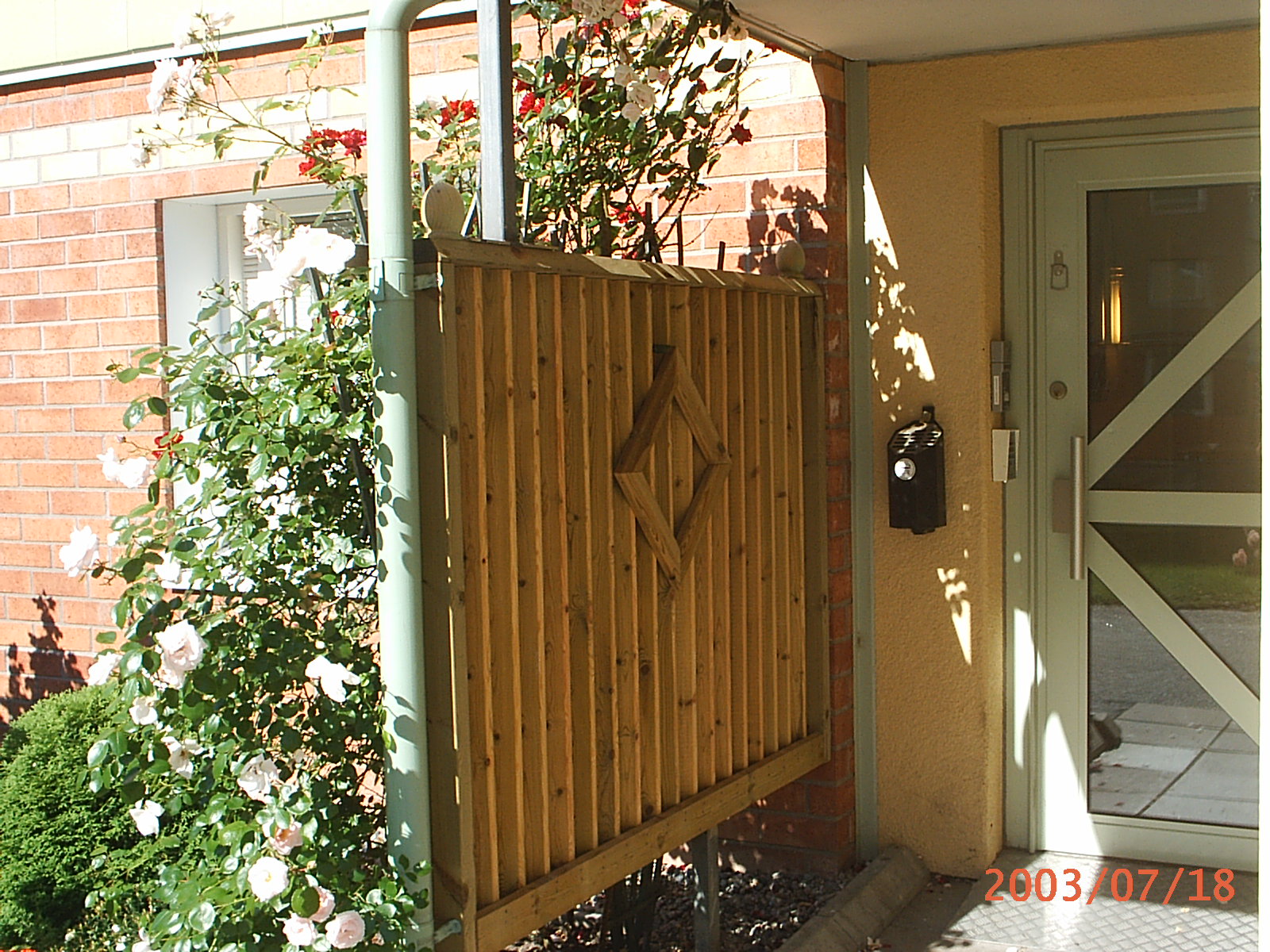 kulör Havreröd. Receptet på kulören är speciellt framtagen Bilden till höger visar platsbyggda vindskydd. Konstruktionen har lättats upp med en spegel mitt på och knoppar på överliggaren. |